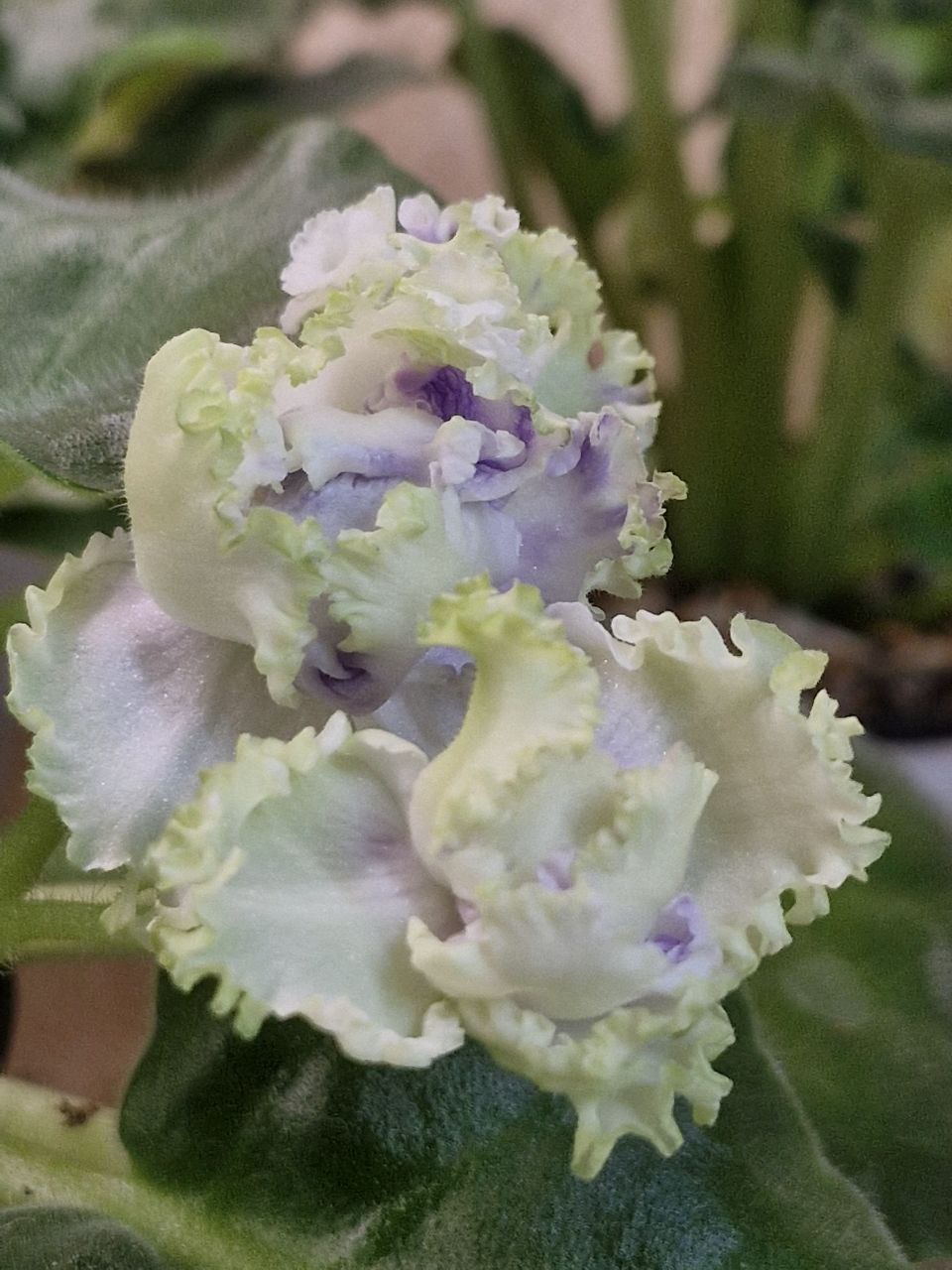 * برگها: گرد یا بیضی شکل، گوشتی، و پوشیده از کرکهای ریز که حالتی مخملی به آنها میدهد. رنگ برگها معمولاً سبز تیره است و در برخی ارقام، برگها ابلق هستند.